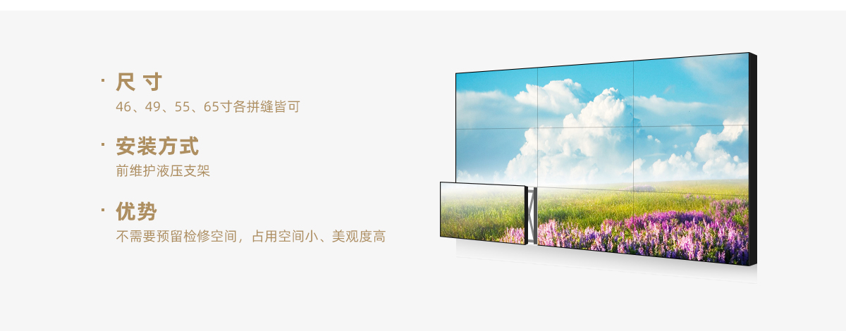 1、前维护液晶拼接单元是在原有的安装方式上添加一个液压支架,根据机械原理实现屏幕的弹出效果;