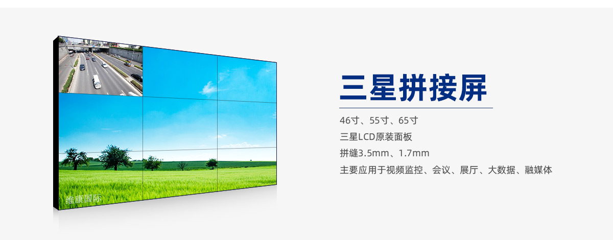 三星拼接屏是我公司主要采用的一种拼接屏面板,全部为三星原装,三星面板加上我公司独立的软件与控制器等其它配件组装成一个整机产品。