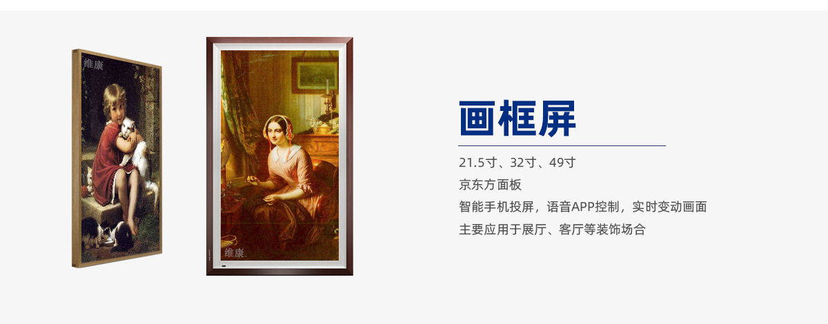 京东方画框屏是一种类似于油画框一样的液晶显示屏,只不过它的功能更加智能化,可以通过手机操控更换画面,给用户以更加多样化的展示效果。