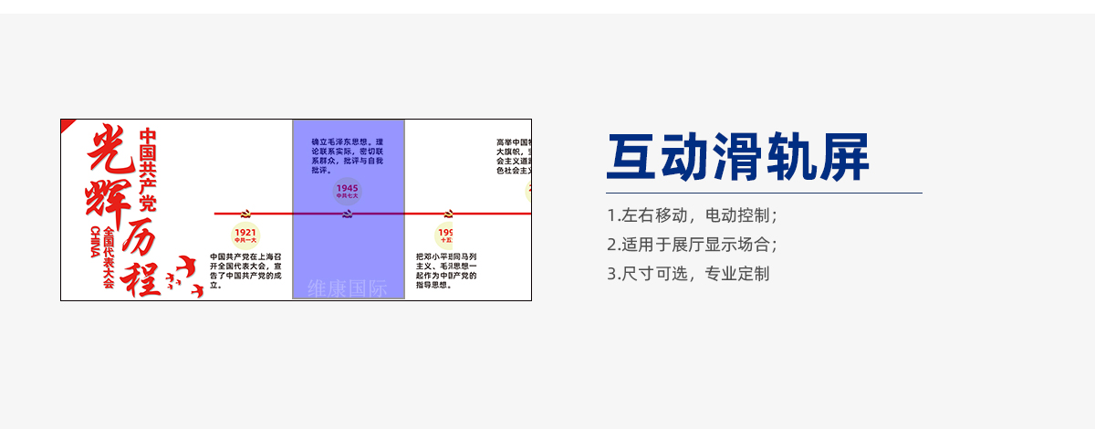 互动滑轨屏是展厅经常使用的一种可移动的屏幕,通过电动轨道控制滑行方式与距离,通常是左右滑动。