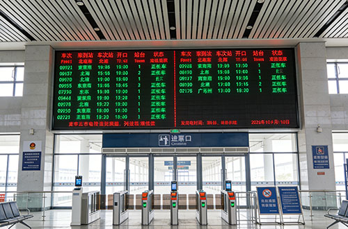在火车站、汽车站的候车大厅,我们经常能看到一些大尺寸的显示屏,用来显示列车车次,还有的是用来播放广告视频,有些用户想知道这种火车站大厅显示屏是用什么做的,用哪种规格做。其实,火车站大厅显示屏基本上都是用的LED或者液晶屏,只不过是做的尺寸大小不同,规格不同,具体用哪种可以根据显示内容来决定。一、LED显示屏LED显示屏是候车大厅主视觉大屏、进站口超大信息屏的首选,用在火车站大厅的主要是全彩、双色两种。如果是用来显示车次信息,那多以双色LED显示屏为主。如果