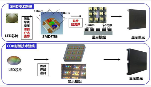什么是COB封装技术?COB封装的优缺点有哪些,许多用户在打造LED小间距显示系统时,经常会听到关于SMD封装或者COB封装这两种概念,却不知道它们的区别,特别是COB封装技术是最近几年才流行的一种LED的封装技术,许多用户还不是非常了解,其它作为一种新型的封装技术,COB有它的优势,但是也有劣势,不能一概地认为COB封装就是更加完善的一种技术。所谓COB封装即板上芯片封装,其实就是一种将LED芯片粘贴在PCB基板上,是一种区别于SMD表贴封装技术的新型封
