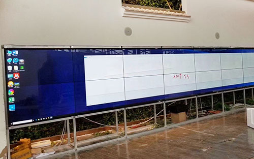 近日,我公司在威海华能电厂安装了三组0.88mm did液晶拼接屏,全部采用2*2拼接,利用支架嵌入在监控中心后墙体内,在屏幕前端设有十余个操作工位,通过高清线使大屏与电脑相连,实现数据的实时传输与显示。0.88mm did液晶拼接屏是目前边框最窄的一款液晶面板,它采用的是LG面板,目前只有55寸一种尺寸,其单屏尺寸与常规的3.5mm拼缝的尺寸基本相同,为1211*682mm左右,它最大的特点就是单屏的拼缝只有0.44mm,拼缝后也不到1mm,是目前拼缝最